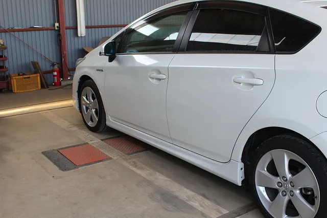 車検の際に検査される、タイヤの横滑り値を計測する装置。通常、民間車検場と同等の設備を備える当社では、より安全性を考慮した車検の事前整備が可能です。
