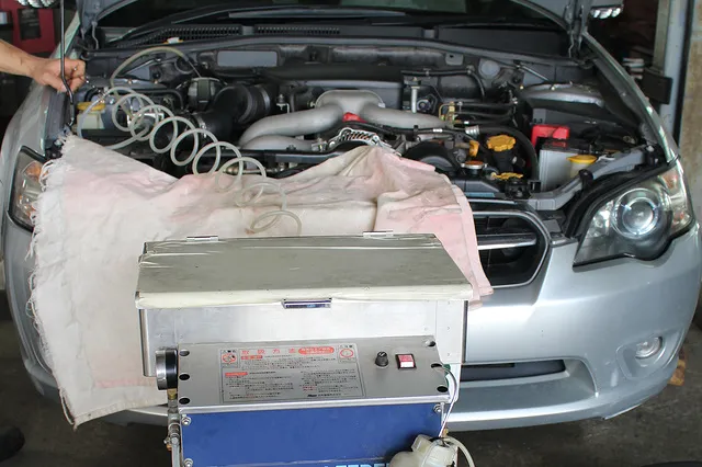 通常、整備士2人がかりで行うブレーキフルード交換作業を1人で行うことができる「電動式自動エア抜き機」。車検整備の作業を効率化し、仕上がりまでの時間を早めます。