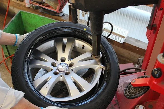 人気のドレスアップパーツホイールの交換です。専用の設備を使ってホイールを傷つけずきれいに交換・取り付けを行います。