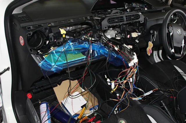 途中経過です。配線の一部の画像ですが、すべてナビと連動させるので、配線の量が多く接続や取り回しが一苦労です。
